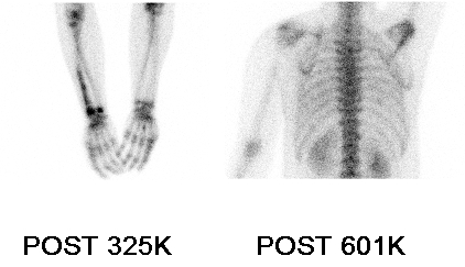 b.針對於感染所進行的骨頭和Ga合併掃描在下列情況皆為陽性:(1)這兩者的活性分布區域相同,而且在相關位置Ga的活性高於骨頭掃描的活性;或者(2)這兩者的活性分布區域並不相同,但是Ga至少比骨頭掃描多出一處以上活性較高的地方。